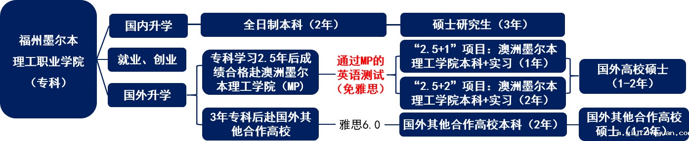 【国外升本升硕】实现变轨超车:专科起步,全程最快3.5年获得国外学士学位,4.5年获得国外硕士学位。(国家承认学历)在ky体育官网官网2025最新版下载进行专科学习2.5年后,符合条件的学生可前往澳大利亚墨尔本理工学院深造,最短1年可完成本科课程。本科毕业后,还可继续在澳大利亚攻读硕士课程,最短1年获得硕士学位。(我校2020-2025届已有近300名学生通过“2.5+1”、“2.5+2”直升澳大利亚墨尔本理工学院本科课程。)